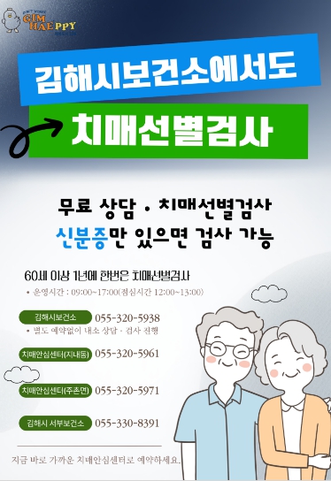 [뉴스노크=김인호 기자] 김해시는 김해시보건소에서도 치매선별검사를 받을 수 있다고 6일 밝혔다.