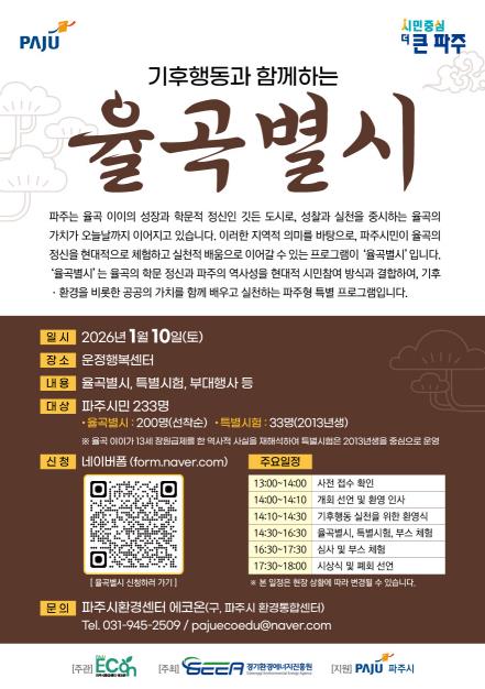 [뉴스노크=김인호 기자] 파주시환경센터 ‘에코온’은 파주를 대표하는 조선시대 사상가 율곡 이이의 학문 정신을 현대적 기후행동 가치로 재해석한 기후문화축제 ‘기후행동과 함께하는 율곡별시’를 오는 내년 1월 10일 운정행복센터에서 개최한다.