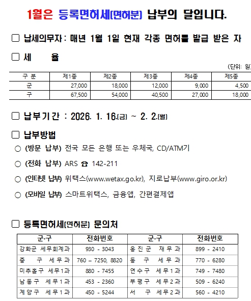 [뉴스노크=김인호 기자] 인천광역시는 2026년 정기분 등록면허세(면허분) 396,262건,총128억 원을 부과·고지했다고 밝혔다.