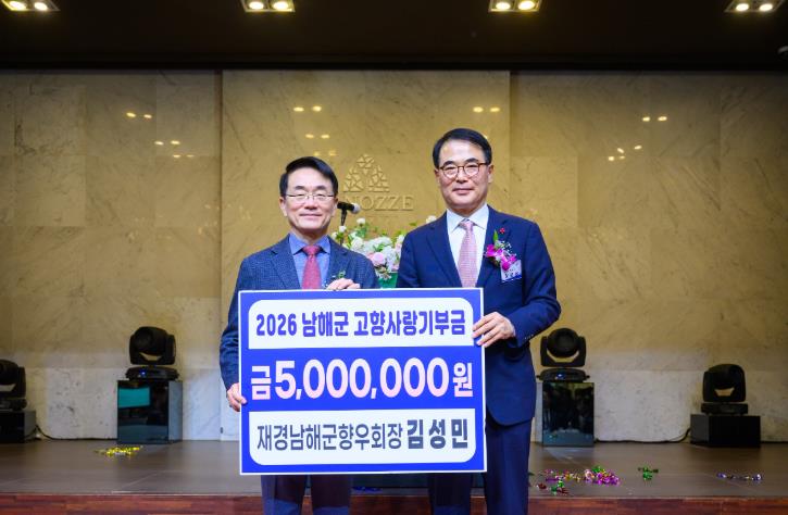 [뉴스노크=김인호 기자] 재경남해군향우회 김성민 회장이 지난 6일 서울에서 열린 ‘2026년 재경향우회 신년하례회’에서 남해군의 발전을 위해 고향사랑기부금 500만 원을 기탁했다.