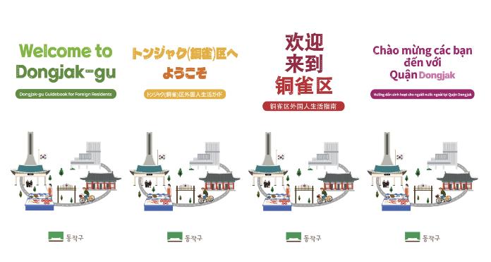 | ▲ ‘동작구 외국인 생활안내서’ 언어별 표지 시안(왼쪽부터 영어, 중국어, 일본어, 베트남어) |