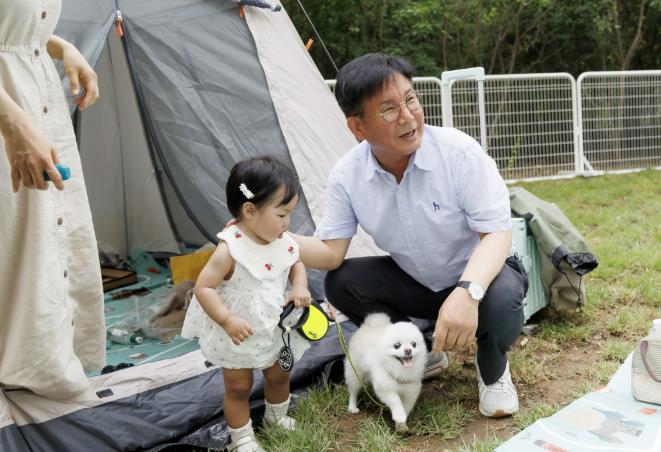 | ▲ 마포구 반려동물 캠핑장에서 반려견과 함께 행복한 시간을 보내고 있는 박강수 마포구청장 |