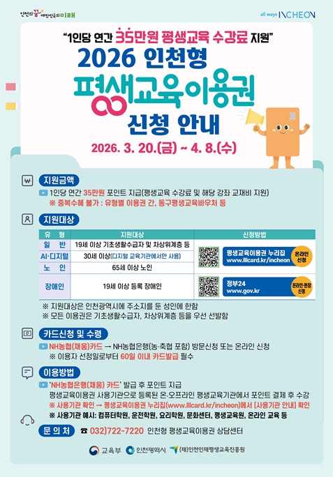 [뉴스노크=김인호 기자] 인천광역시는 시민 누구나 차별 없이 평생학습에 참여할 수 있는 환경을 조성하고 시민의 미래 역량 강화를 위해 '2026년 평생교육이용권 지원사업'을 본격 추진한다고 밝혔다.