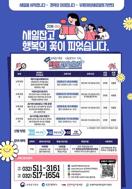 [뉴스노크=김인호 기자] 부평여성새로일하기센터는 성평등가족부와 인천광역시의 지원을 받아 2026년 직업교육훈련 과정 참여자를 모집한다고 밝혔다.