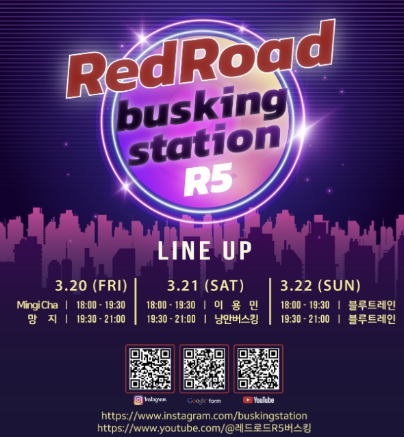 3월 20일부터 22일까지 레드로드 R5 버스킹존에서는 오후 6시부터 9시 보컬과 댄스 등 다채로운 장르의 공연이 시간대별로 펼쳐져 주말 내내 방문객의 발길을 사로잡을 예정이다.