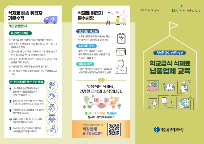 또한 학교가 안전한 식재료를 공급받을 수 있도록 리플릿 뒷면에는 별도의 접속 절차 없이 모바일로 신고할 수 있는 ‘위장업체 신고센터 QR코드’를 수록했다. 이와 함께 식재료 취급자 준수사항을 안내하여 납품 시 반드시 확인해야 할 핵심 사항을 상세히 담았다.