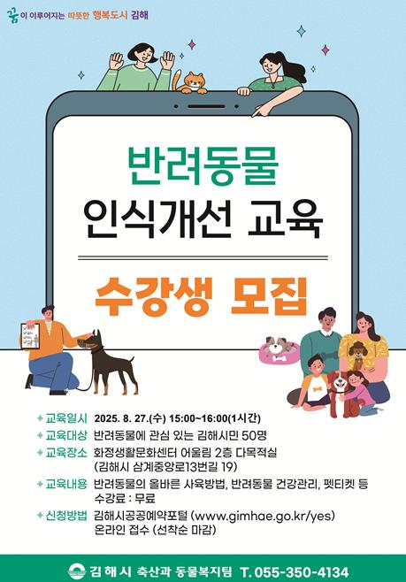 [뉴스노크=김인호 기자] 김해시는 올바른 반려동물 문화 조성을 위해 오는 8월 27일 화정생활문화센터 어울림 다목적실에서 시민 대상 ‘반려동물 인식개선 교육’을 실시한다고 30일 밝혔다.