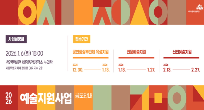 [뉴스노크=김인호 기자] 세종시문화관광재단은 세종시 예술인들의 창작활동 활성화와 시민의 문화예술 향유 기회를 확대하기 위한 2026년 예술지원사업 공모를 진행한다.