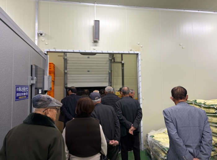 ▲ 대한노인회 청양군지회 직원과 경로당 분회장들이 대치면 먹거리종합타운을 둘러보며, 무상급식 및 공공급식 사업 관련 현장을 점검하고 있는 모습