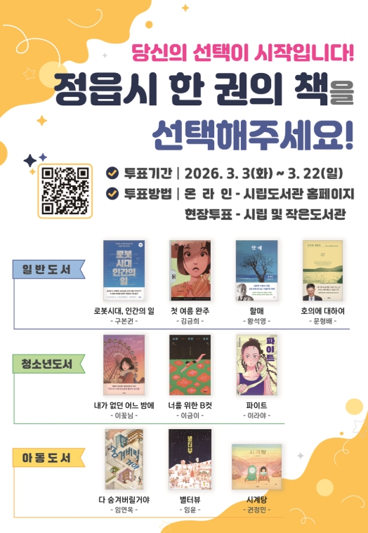 [뉴스노크=김인호 기자] 정읍시가 시민이 함께 읽고 공감하는 독서문화 확산을 위해 2026년 ‘한 권의 책’ 선정을 위한 시민 투표를 오는 22일까지 온·오프라인으로 실시한다.