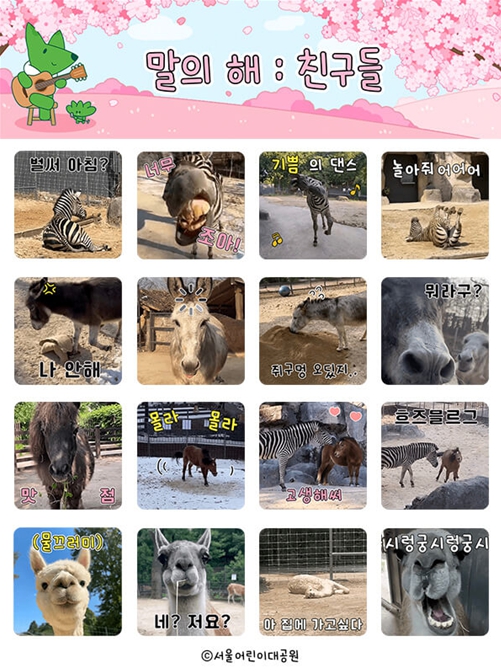이모티콘은 얼룩말 ‘세로’(4종)를 비롯해 당나귀 ‘옹키·동키’(4종), 미니말 ‘나나·향미’(4종), 알파카(2종), 과나코(2종) 등 대공원 마스코트들의 귀여운 모습과 일상 문구를 담았다. ‘벌써 아침?’, ‘너무 조아!’, ‘아 집에 가고 싶다’ 등 실생활에서 유용하게 사용할 수 있는 재치 있는 표현들로 구성했다.
