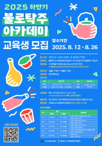 불로탁주 아카데미는 불로동 도시재생사업의 일환으로 운영되는 주민 참여형 전통주 교육 프로그램으로, 실습 중심의 커리큘럼과 창업 연계 가능성으로 매년 높은 관심을 받아왔다.
