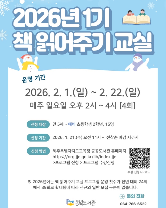 [뉴스노크=김인호 기자] 제주도교육청 동녘도서관은 2월 1일부터 22일까지 평생교육실에서 유아 및 저학년 어린이의 독서 흥미와 창의력 향상을 위한 ‘2026년 1기 책 읽어주기 교실’을 운영한다.