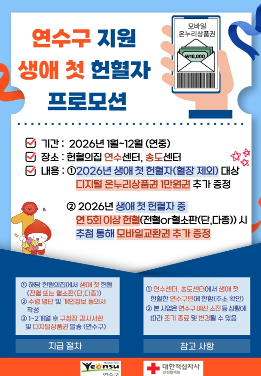 연수구, 생애 첫 헌혈자 지원 및 헌혈 장려 사업 진행