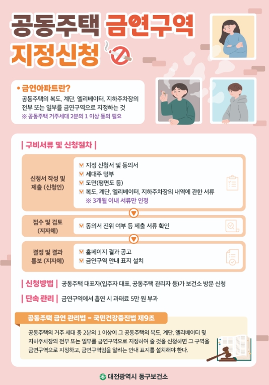 금연구역 지정을 희망하는 공동주택은 전체 거주 세대의 2분의 1 이상 동의를 받아 신청할 수 있으며, 신청 시 ▲금연구역 지정 신청서 ▲세대주 동의서(전자투표 가능) ▲세대주 명부 ▲복도·계단·엘리베이터·지하주차장 도면 등을 제출해야 한다.