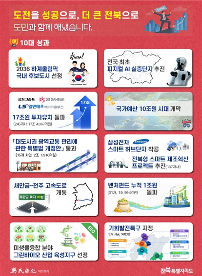 전북자치도는 지난 3여 년간 이어온 끊임없는 도전과 이뤄 왔던 성과 위에서 한계를 뛰어넘고 기대를 충족하는 성취를 이뤄내, 그 결실이 도민의 삶 전반에 온전히 공유되도록 하겠다고 밝혔다.