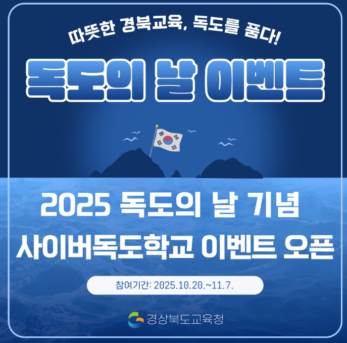 [뉴스노크=김인호 기자] 경북교육청은 독도의 날(10월 25일)을 맞아 20일부터 다음 달 7일까지 3주간, 전 국민이 참여할 수 있는 ‘2025 독도의 날 기념 독도사랑 온라인 축제’를 운영한다고 밝혔다.