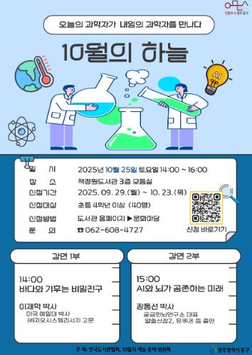 [뉴스노크=김인호 기자] 광주 동구는 25일 오후 2시 구립도서관 책정원 3층 모둠실에서 미래 과학자를 꿈꾸는 청소년들을 위한 특별 과학 강연 행사인 ‘10월의 하늘’을 개최한다고 밝혔다.