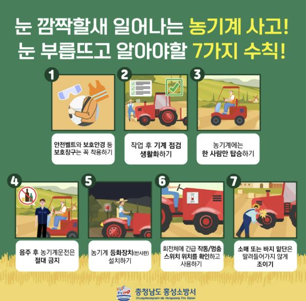 홍성소방서는“농작업 중 방심은 큰 사고로 이어질 수 있다”며 ▲작업 전 장비 점검 ▲안전모·안전화 착용 ▲음주운전 금지 ▲야간작업 시 조명 확보 ▲경사지 작업 시 속도 조절 등을 강조했다. 또한 고령 농업인의 경우 반사띠나 밝은 색상의 작업복을 착용해 가시성 확보에 유의해야 한다고 덧붙였다.