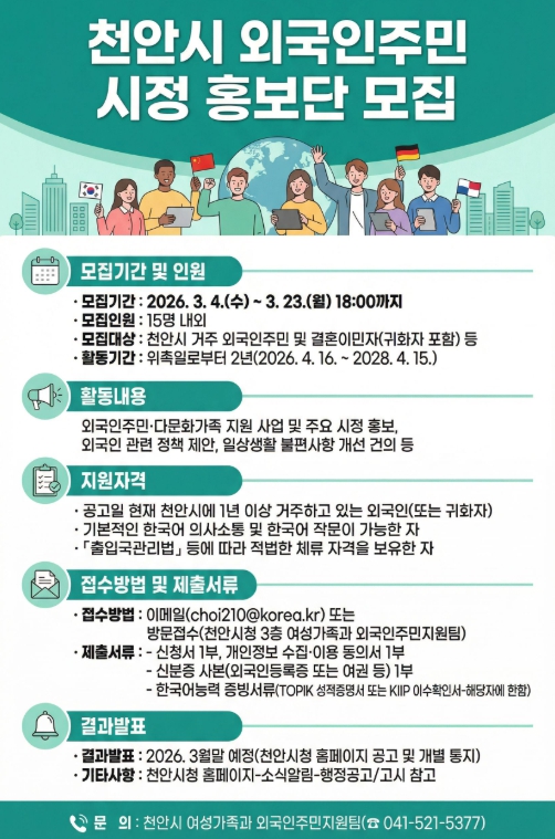 [뉴스노크=김인호 기자] 천안시가 외국인 주민의 시각으로 지역 소식을 전하고 시정 운영에 참여할 ‘2026년 천안시 외국인주민 시정 홍보단’을 모집한다.