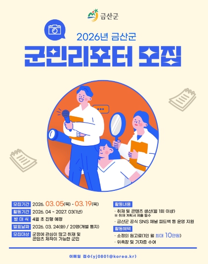 [뉴스노크=김인호 기자] 금산군은 군민의 시선으로 지역의 다양한 이야기를 전할 2026년 군민리포터를 공개 모집한다.