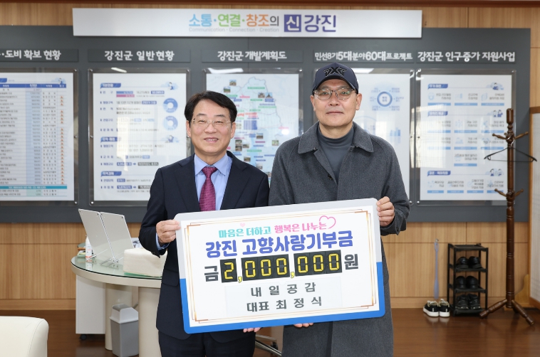 [뉴스노크=김인호 기자] 최정식 내일공감 대표가 지역 발전을 염원하는 따뜻한 마음을 담아 강진 고향사랑기부제에 동참하며 나눔 문화 확산에 앞장섰다.