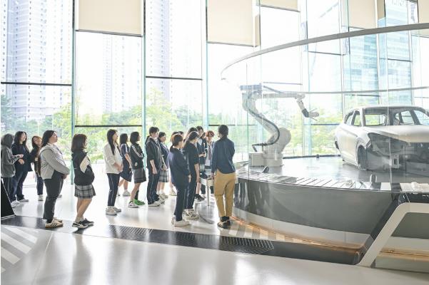 | ▲ 세그루패션디자인고 학생들이 지난 10월 1일 ‘현대모터스튜디오’를 방문, 로봇 자동화 공정 과정에 대한 설명을 듣고 있다. |