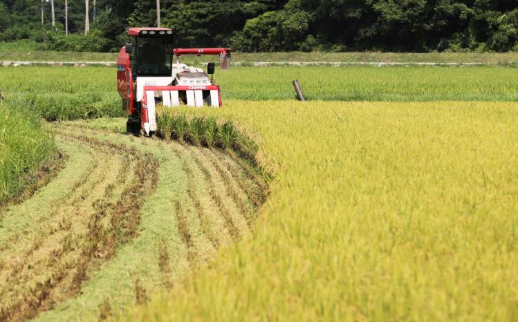 ▲ 볏짚을 갈아넣기 위해 볏짚을 잘라내며 벼를 수확하고 있다. |