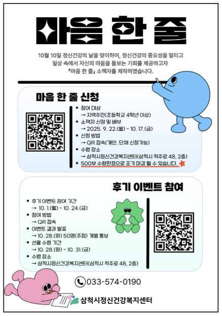 소책자 신청은 9월 22일부터 10월 17일까지 QR코드를 통해 가능하며, 선착순 500부에 한해 배부된다. 수령은 삼척시정신건강복지센터(삼척시 척주로 48, 2층)에서 직접 할 수 있다. 아울러 소책자 활용 후기를 공유하는 이벤트도 함께 진행되며, 참여 기간은 10월 1일부터 10월 24일까지 QR코드를 통해 참여할 수 있다.