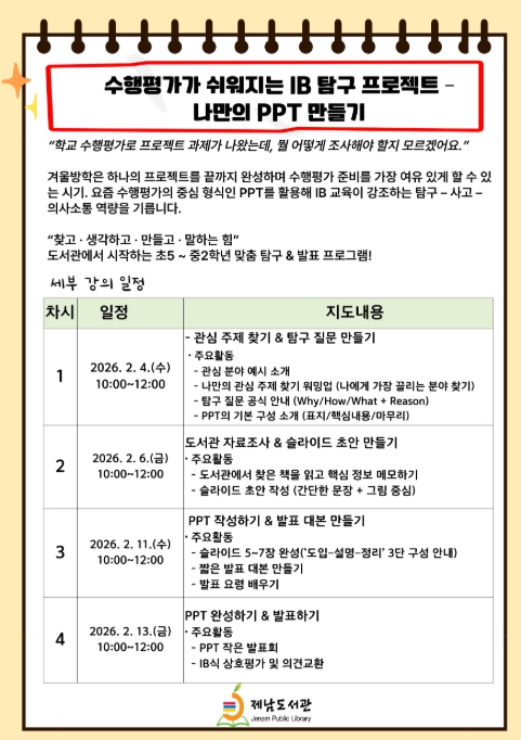 제남도서관 관계자는 “이번 프로그램을 통해 학생들이 스스로 주제를 정하고 탐구하는 경험을 쌓음으로써 자기주도적 학습 역량을 기르고 학교 수행평가와 발표 수업에 대한 자신감을 높이는 계기가 되길 바란다”고 말했다.