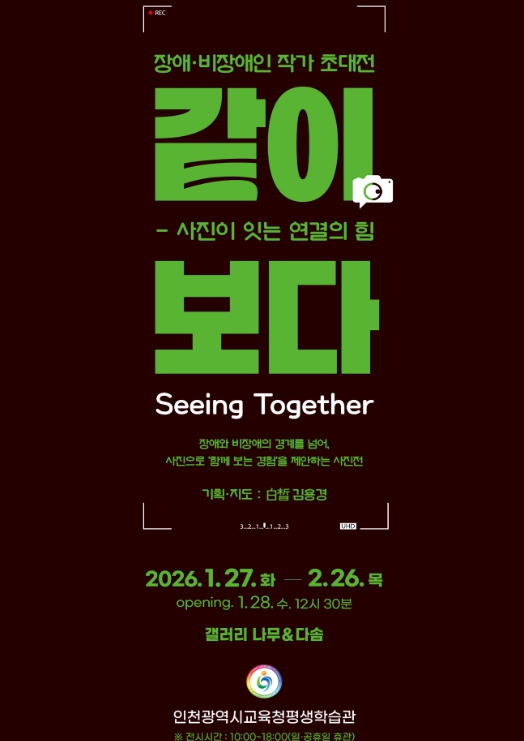 [뉴스노크=김인호 기자] 인천광역시교육청평생학습관은 인천 시민을 대상으로 2층 갤러리 나무와 다솜에서 ‘같이, 보다(Seeing Together) 장애인 작가 초대전’을 개최한다.