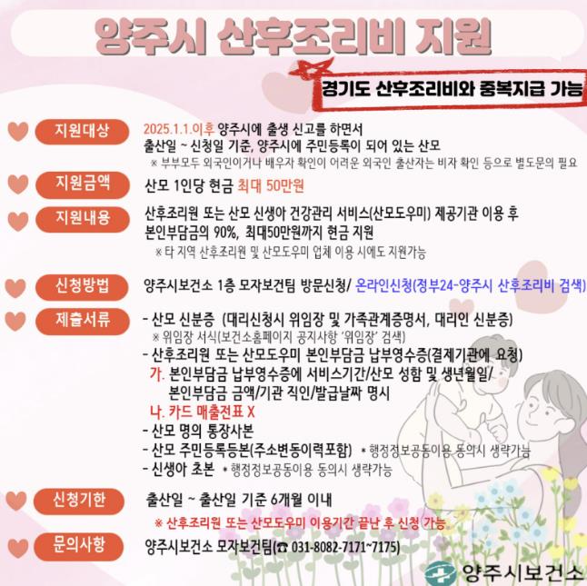 [뉴스노크=김인호 기자] 양주시보건소가 2025년 1월 1일 출생아부터 관내 출산가정을 대상으로 ‘양주시 산후조리비 지원사업’을 시행하고 있다.
