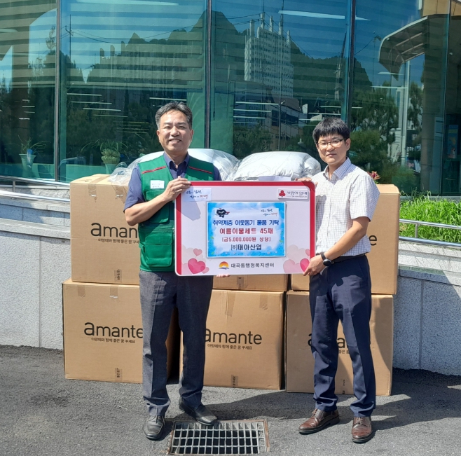 [뉴스노크=김인호 기자] ㈜태아산업(본사: 대전광역시)은 지난 31일 김천시 대곡동 행정복지센터를 방문해 관내 취약계층 가정을 위한 여름 이불 세트 45채(500만 원 상당)를 기부하며 지역사회에 뜻깊은 나눔을 실천했다.