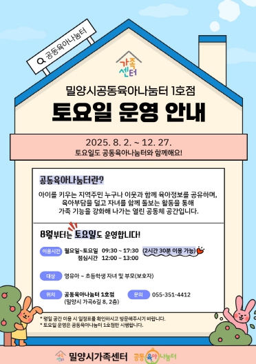[뉴스노크=김인호 기자] 경남 밀양시는 맞벌이 가정 등 평일 이용이 어려운 시민들의 수요를 반영해 공동육아나눔터의 주말 운영을 8월부터 확대한다고 1일 밝혔다.