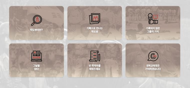 주요 메뉴는 △학도병이란 △기록으로 만나는 학도병 △기록되지 않은 그들의 기억 △그날을 읽다 △빈 학적부를 채워주세요 △경북교육청은 기억하겠습니다 등으로 구성됐다.