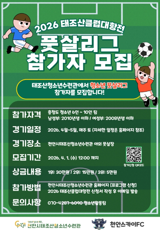[뉴스노크=김인호 기자] 천안시청소년재단 산하 천안시태조산청소년수련관은 청소년의 건강한 여가 활동과 스포츠 참여 기회를 확대하기 위해 ‘2026 태조산 클럽대항전 풋살리그’ 참가팀을 모집한다고 20일 밝혔다.