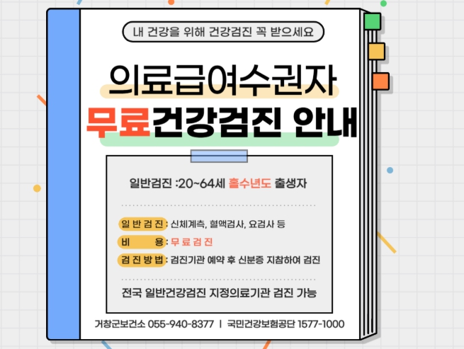 [뉴스노크=김인호 기자] 거창군은 의료급여수급권자의 건강증진과 만성질환 조기 발견을 위해 일반건강검진 사업을 연중 무료로 실시하고 있으며, 대상자의 조기 수검 참여를 적극 독려하고 있다고 지난 5일 밝혔다.