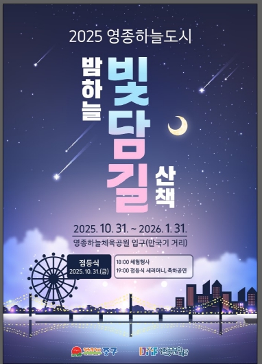 [뉴스노크=김인호 기자] (재)인천중구문화재단(이사장 김정헌)은 올해 10월 31일부터 오는 2026년 1월 31일까지 3개월간 야간 경관조명 ‘2025 영종 빛 축제 - 영종하늘도시 밤하늘 빛담길’을 운영한다고 밝혔다.