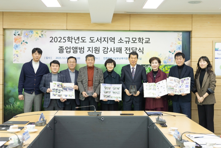 [뉴스노크=김인호 기자] 인천남부교육지원청은 26일 남부 도서학교 졸업앨범 무료 제작에 협력한 인천사진앨범인쇄협동조합, 푸르미재단, 기호일보와 함께 전수식 및 감사패 전달식을 개최했다.