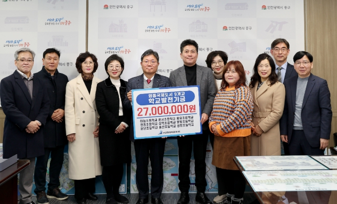 김정헌 중구청장은 “어려운 경제 여건에도 영종국제도시 지역 교육 발전에 깊은 관심을 두고, 통 큰 나눔을 실천해 주신 기업에 진심으로 감사하다”라며 “앞으로도 관내 기업·단체와의 교류를 강화해 지속 가능한 교육 나눔 문화를 확산하고 지역 인재 육성에 대한 지원을 아끼지 않겠다”라고 말했다.