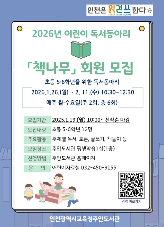 [뉴스노크=김인호 기자] 인천광역시교육청주안도서관은 예비 초등 5·6학년 학생을 대상으로 하는 독서동아리 '책나무' 회원을 모집한다.