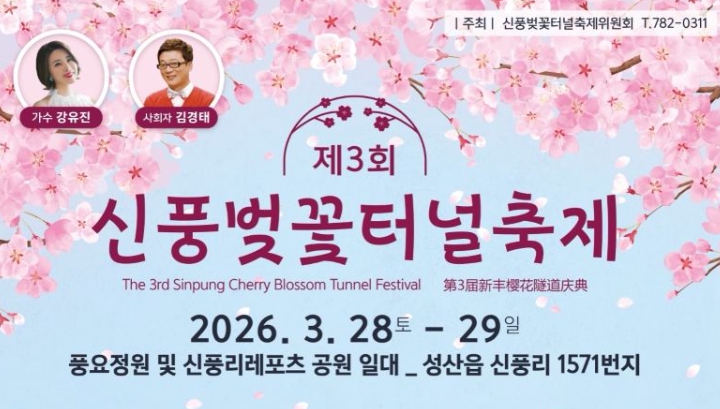 [뉴스노크=김인호 기자] 서귀포시는 몸과 마음이 가벼워지는 따스한 봄, 가족・연인・친구 간의 잊지 못할 추억을 선사할 제3회 신풍벚꽃터널축제가 28일~29일 양일간 성산읍 풍요정원 및 신풍리레포츠 공원 일원에서 개최된다고 밝혔다.