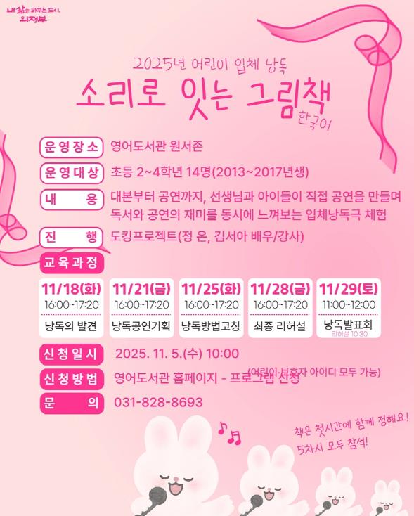 [뉴스노크=김인호 기자] 의정부시 도서관은 11월, 2025년 어린이 입체낭독 ‘소리로 잇는 그림책’을 총 5회에 걸쳐 의정부영어도서관에서 운영한다.