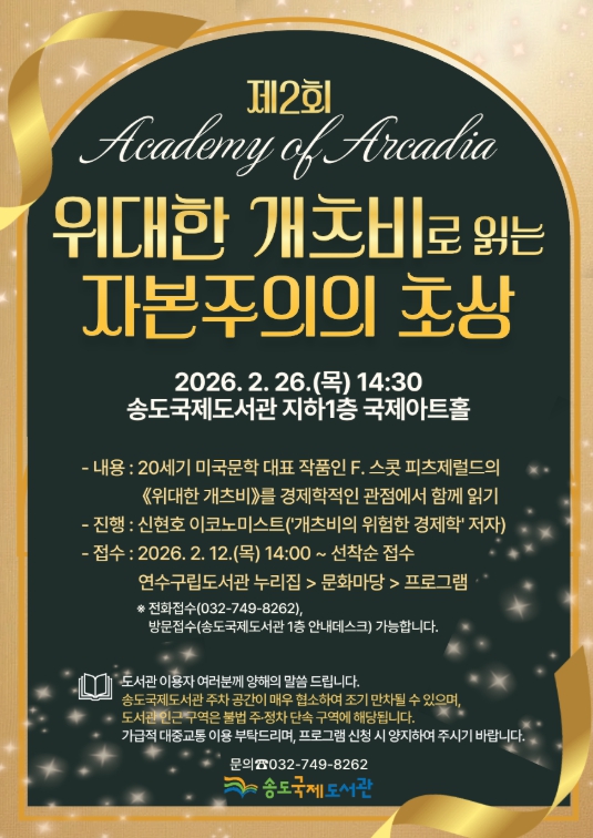 [뉴스노크=김인호 기자] 연수구 송도국제도서관은 오는 26일 14시 30분, 인문학 프로그램 ‘제2회 아카데미 오브 아르카디아(Academy of Arcadia)’를 개최한다.