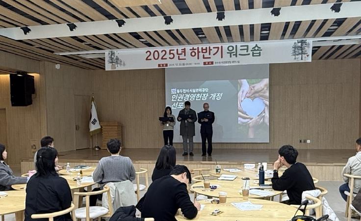 [뉴스노크=김인호 기자] 동두천시 시설관리공단은 지난 22일 동두천 자연휴양림 세미나실에서 열린 2025년 하반기 워크숍에서 인권경영 헌장 개정 및 선포식을 개최했다고 밝혔다.