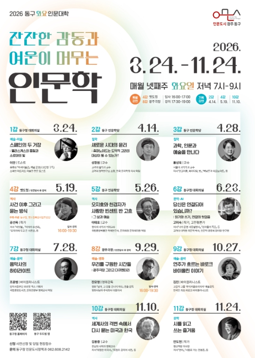 [뉴스노크=김인호 기자] 광주 동구는 ‘잔잔한 감동과 여운이 머무는 인문학’을 주제로 예술, 철학, 역사, 문학 등 각 분야의 명망 있는 강사들을 초청해 진행하는 ‘동구 화요 인문대학’을 24일 개강한다고 밝혔다.