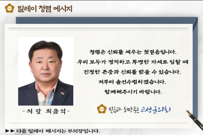 최을석 의장은 “청렴은 신뢰를 세우는 첫걸음”이라며 “의장으로서 먼저 릴레이에 참여하게 되어 뜻깊고, 모든 의원들과 함께 청렴한 고성군의회를 만들어가겠다”고 전했다. 고성군의회는 앞으로도 다양한 활동을 통해 투명하고 신뢰받는 지방의회 구현에 앞장설 방침이다.