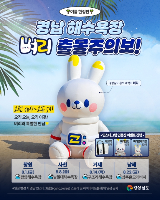 [뉴스노크=김인호 기자] 경상남도는 본격적인 여름 피서철을 맞아, 도내 해수욕장을 찾는 관광객에게 특별한 추억을 선사하고자 경상남도 홍보캐릭터 ‘벼리’ 공기조형물을 설치하고 참여형 SNS이벤트를 진행한다고 밝혔다.