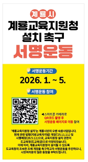 계룡시는 본 서명 운동이 지역 교육의 미래를 바꿀 중요한 시작점이 될 것으로 기대하며, 학부모와 시민들이 한마음으로 협력해 교육 현장의 목소리를 적극적으로 담아내는 계기가 되길 기대하고 있다.