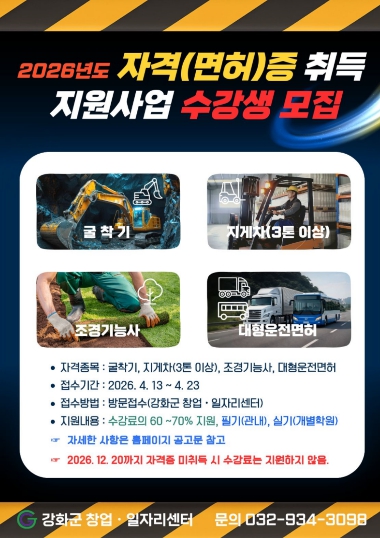자격(면허)증 취득 지원사업과 관련한 더 자세한 사항은 강화군 창업·일자리센터로 문의하거나 홈페이지 공고문을 참고하면 된다.